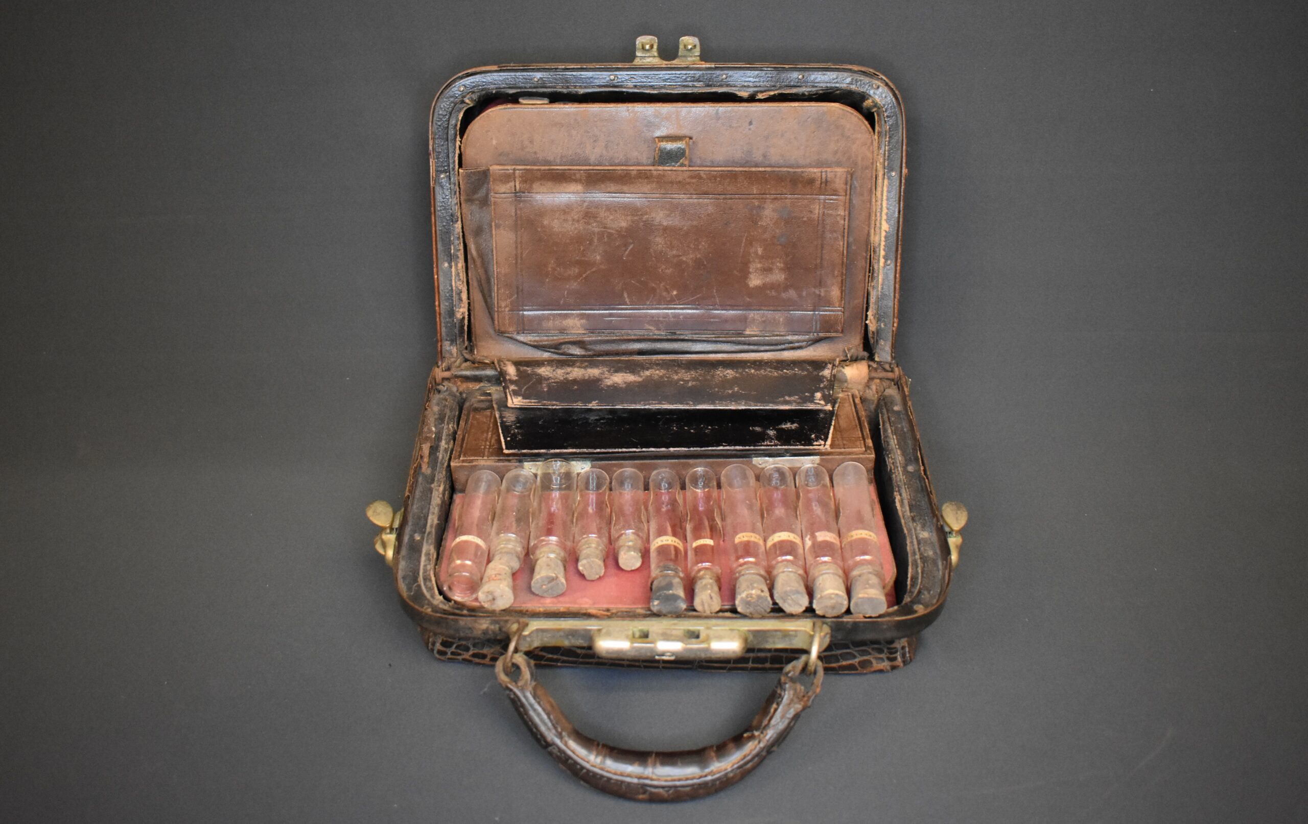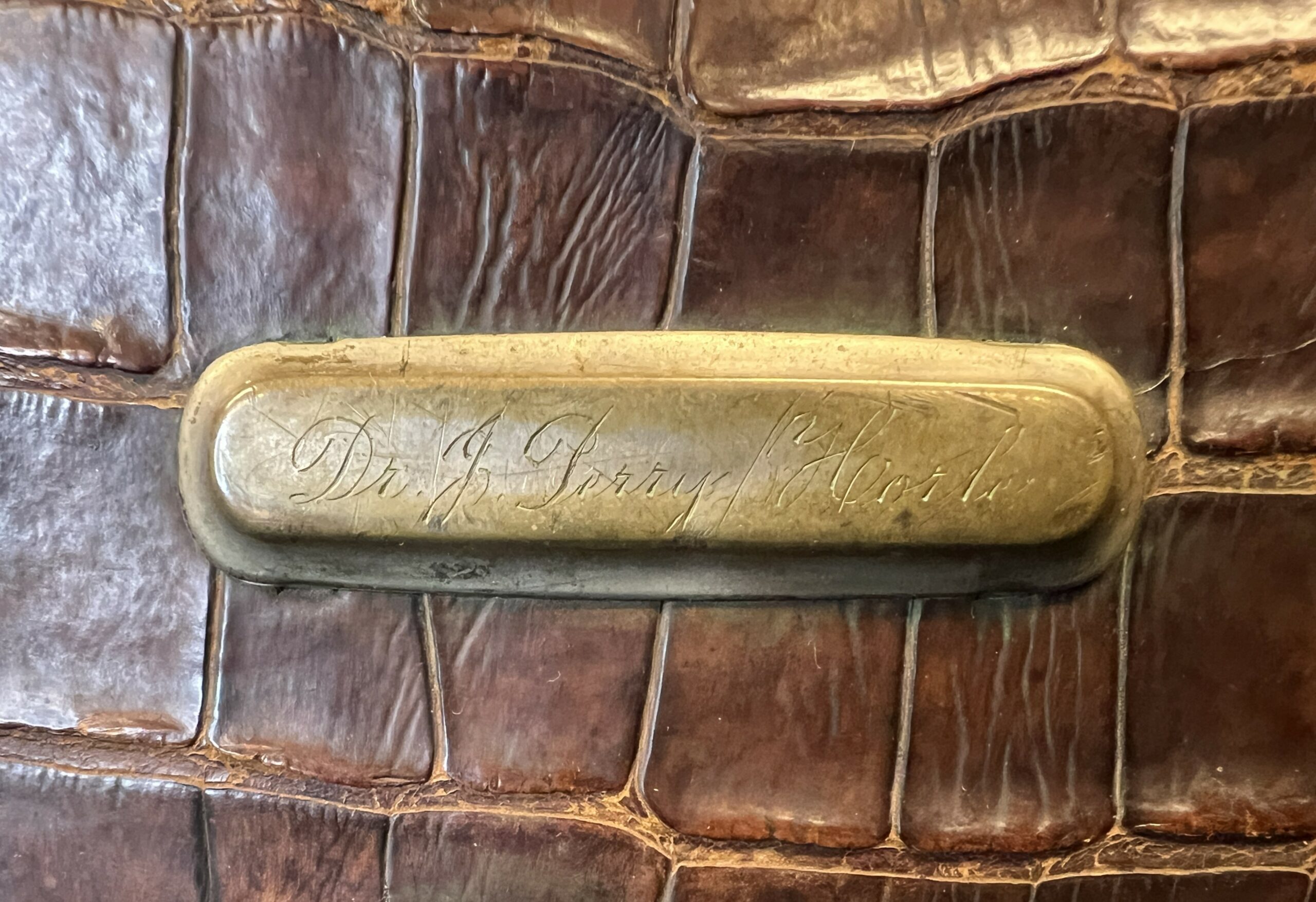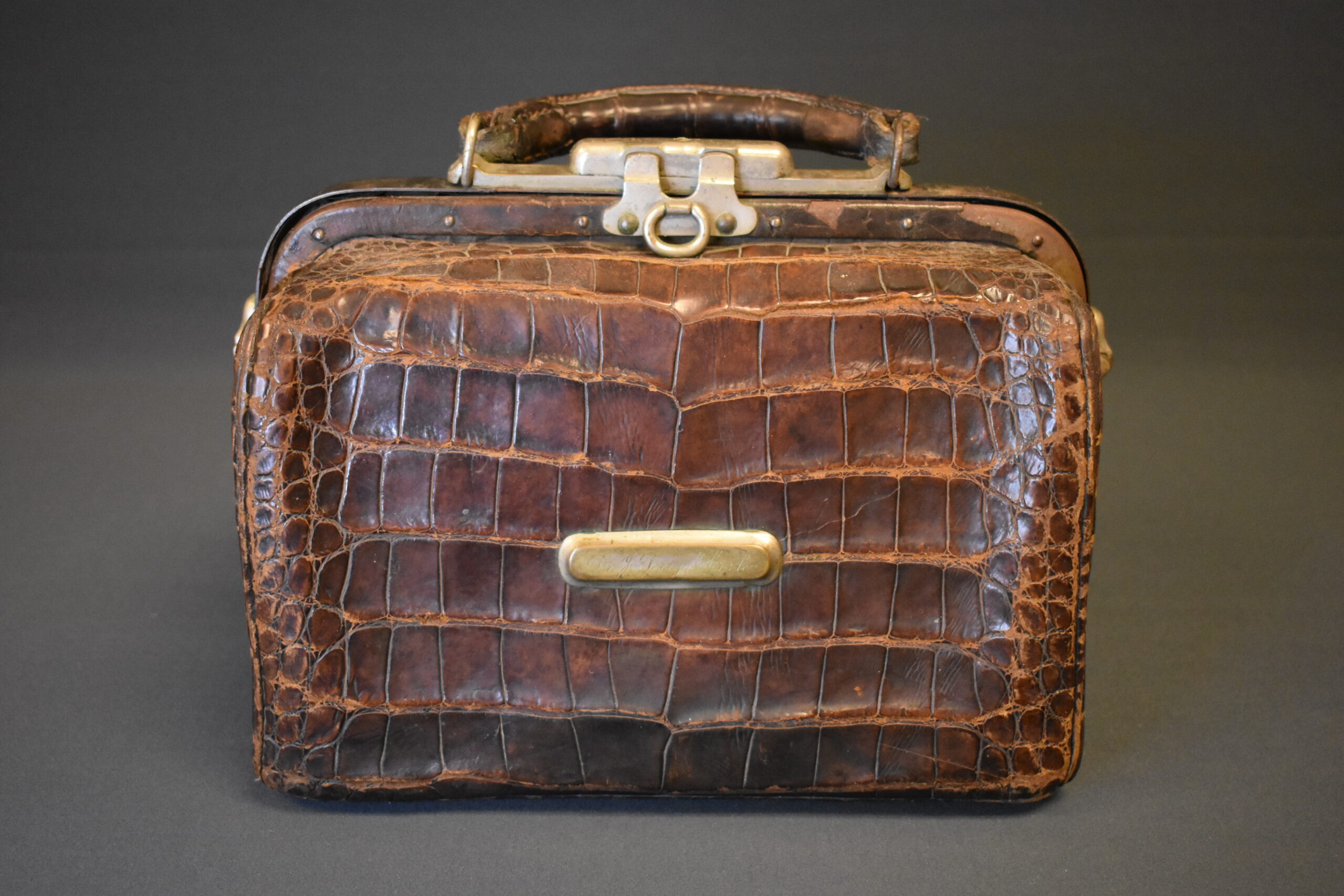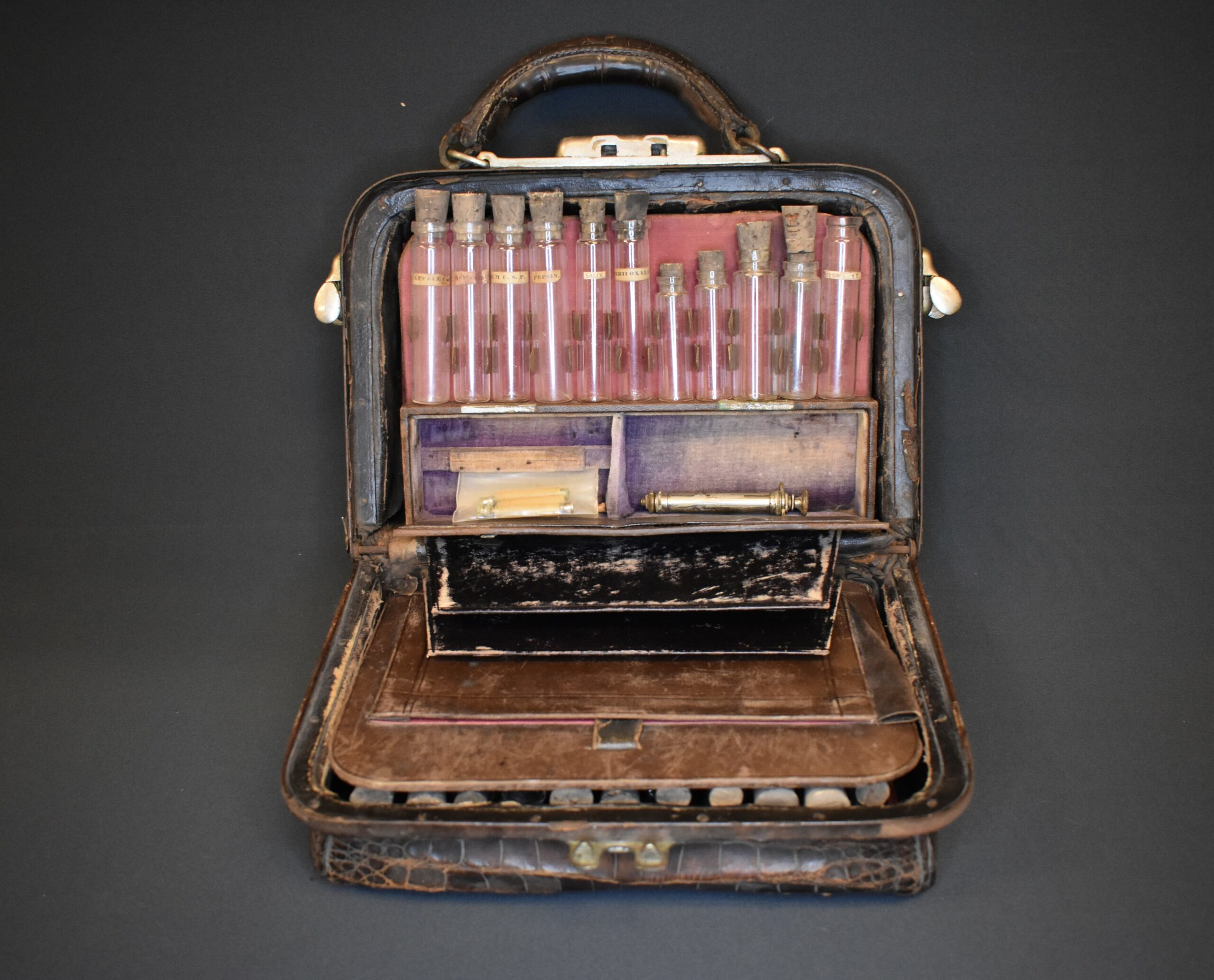An alligator skin doctor’s bag. The bag has latches made of brass and a carry handle also in alligator. There is a brass plate on the front that is inscribed “Dr. J. Perry Horle.” The inside of the case has several compartments. One side has a removeable insert that holds eleven glass vials with corks and identified by paper labels. The back of the insert is covered in brown leather and has a pocket for papers and such. Behind this insert is space for an additional eight vials. On the other side of the case is space for eleven more vials. Underneath the vials is a compartment with a door made of brown leather and lined with purple velvet. Inside is a brass syringe and parts of a syringe.