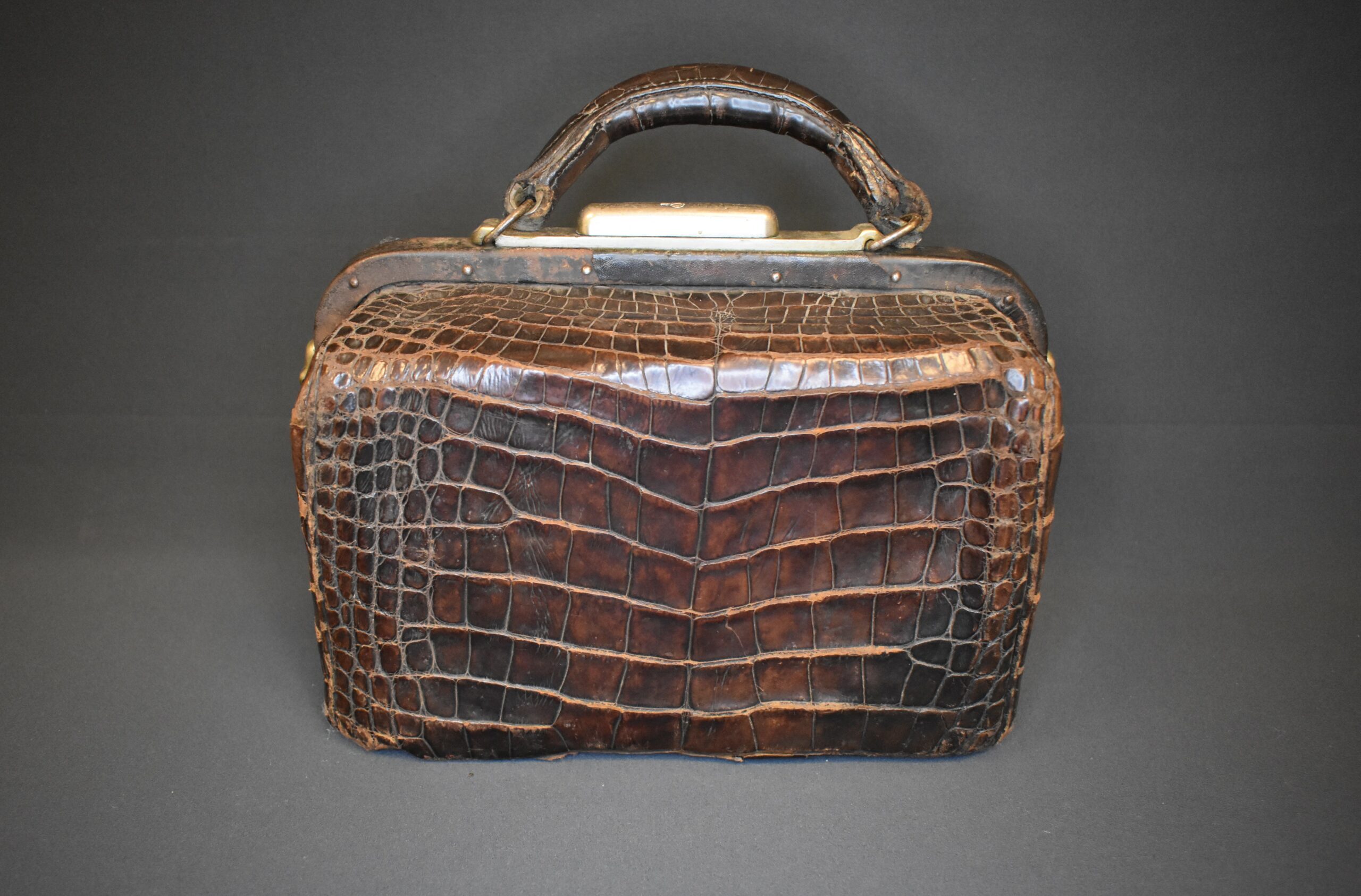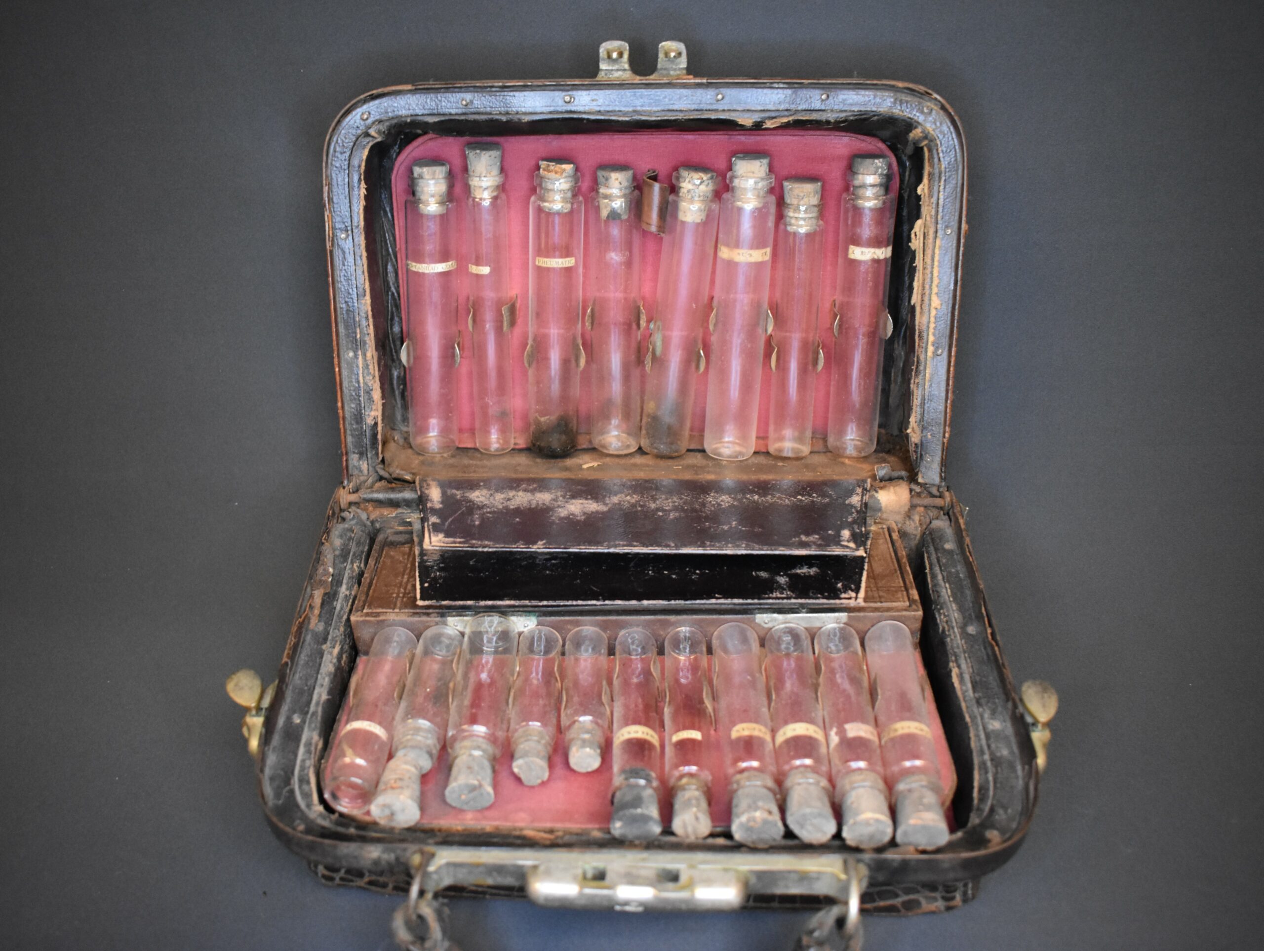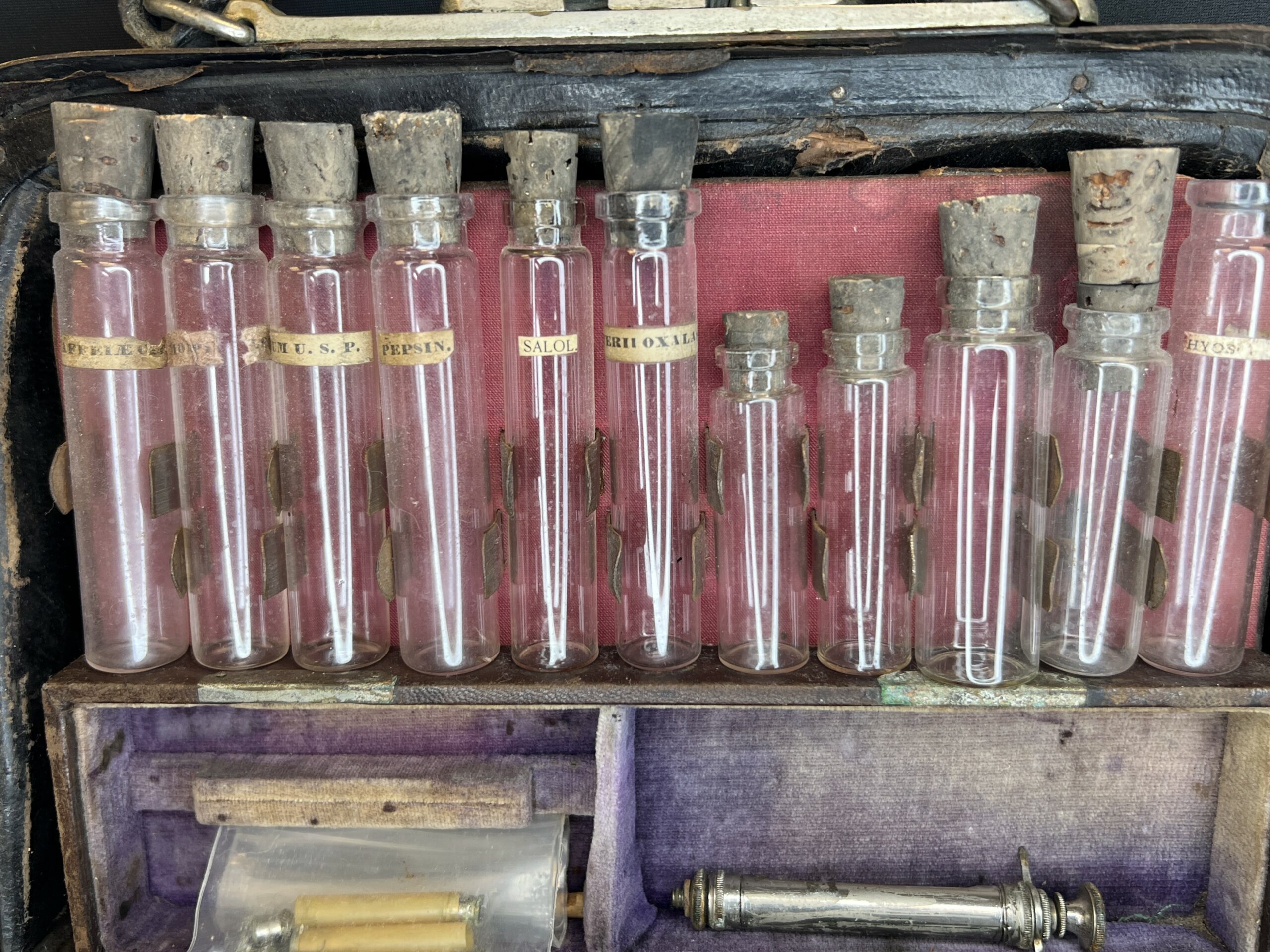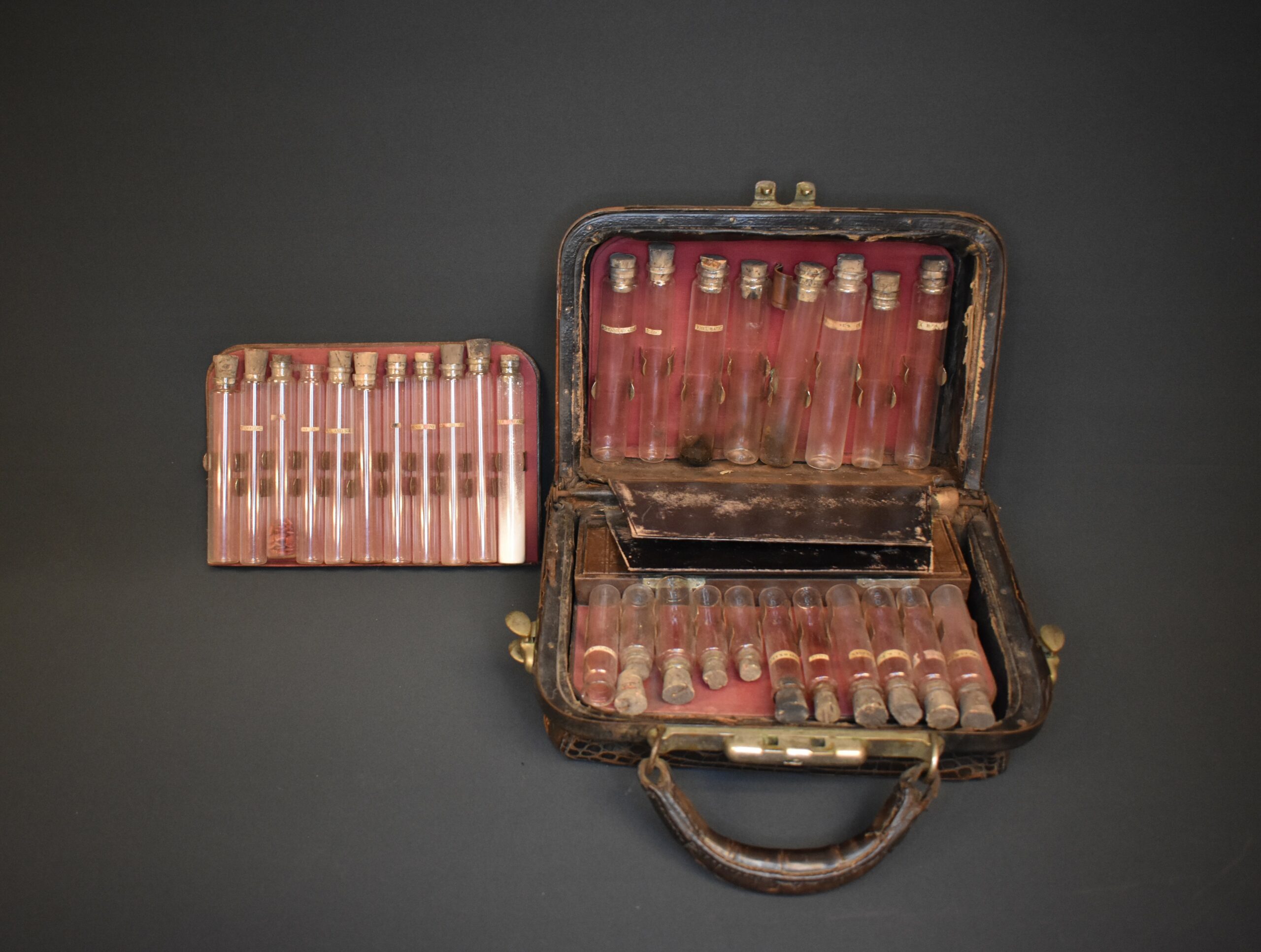 An alligator skin doctor’s bag. The bag has latches made of brass and a carry handle also in alligator. There is a brass plate on the front that is inscribed “Dr. J. Perry Horle.” The inside of the case has several compartments. One side has a removeable insert that holds eleven glass vials with corks and identified by paper labels. The back of the insert is covered in brown leather and has a pocket for papers and such. Behind this insert is space for an additional eight vials. On the other side of the case is space for eleven more vials. Underneath the vials is a compartment with a door made of brown leather and lined with purple velvet. Inside is a brass syringe and parts of a syringe.