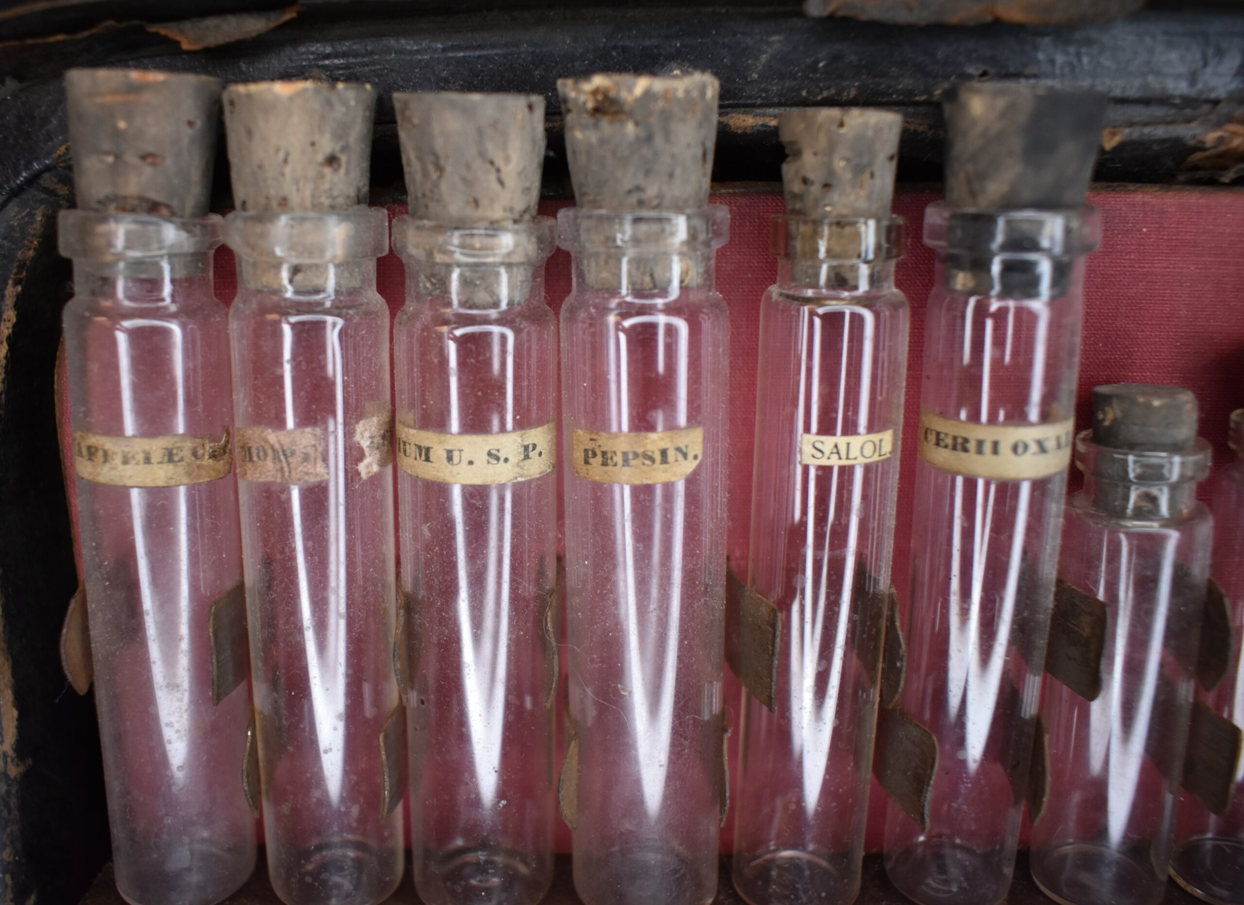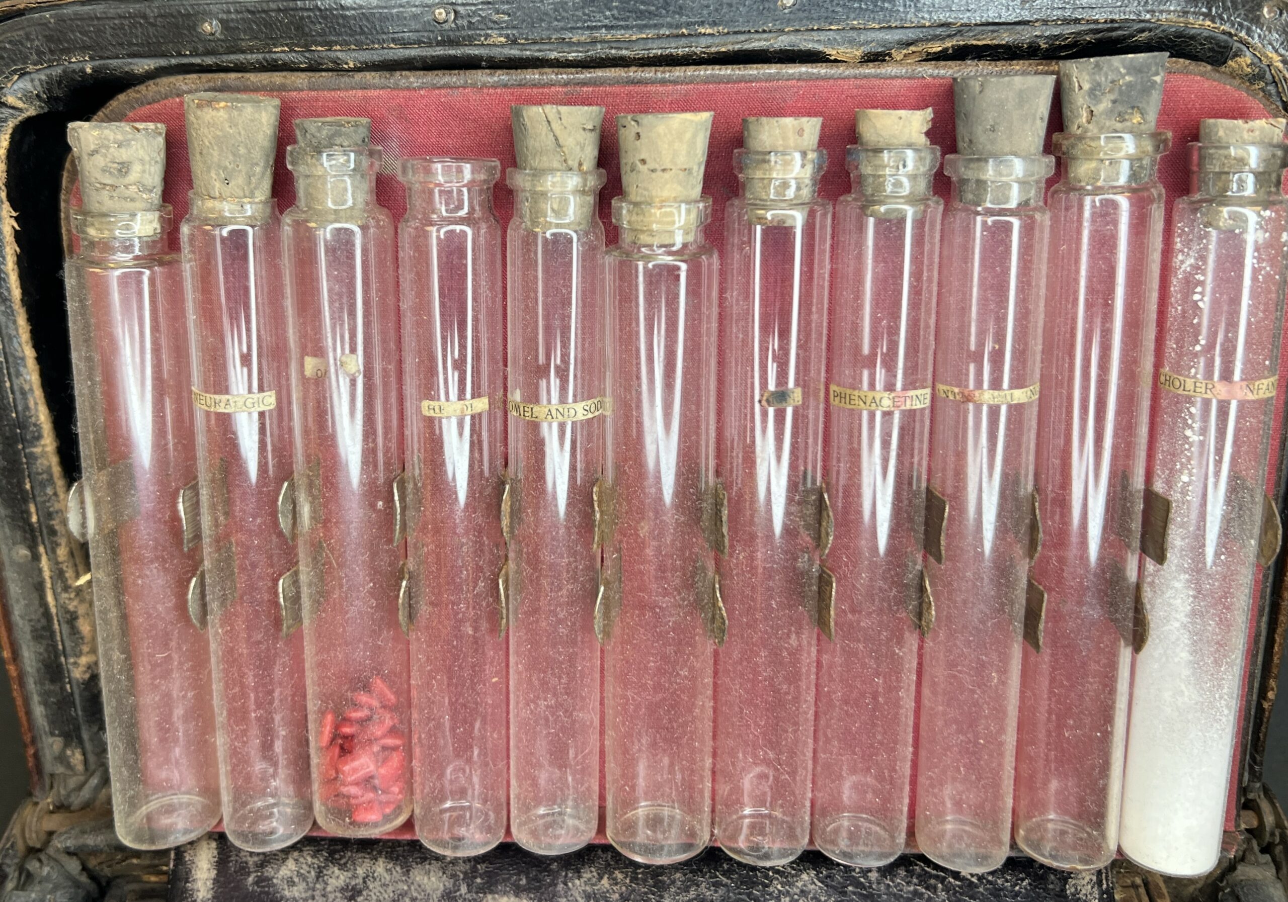 This particular bag was purchased from another living history village that had closed its doors. The bag was then sent to the Williamstown Art Conservation Center for cleaning and maintenance. Noticing that the vials still contained substances, they sent them to Williams College for analysis. They did indeed contain drugs that are either dangerous or controlled today. They found hazardous substances such as mercury as well as controlled substances like opioids, strychnine, digitalis, morphine, and atropine. One of the vials was labeled quinine as well. The contents of the vials had to be disposed of in the college’s hazardous waste facility as well as the DEA licensed Neuroscience department. Around the beginning of the 20th century allopathy had become the dominant medical practice although homeopathic practitioners and remedies are still popular with some today.