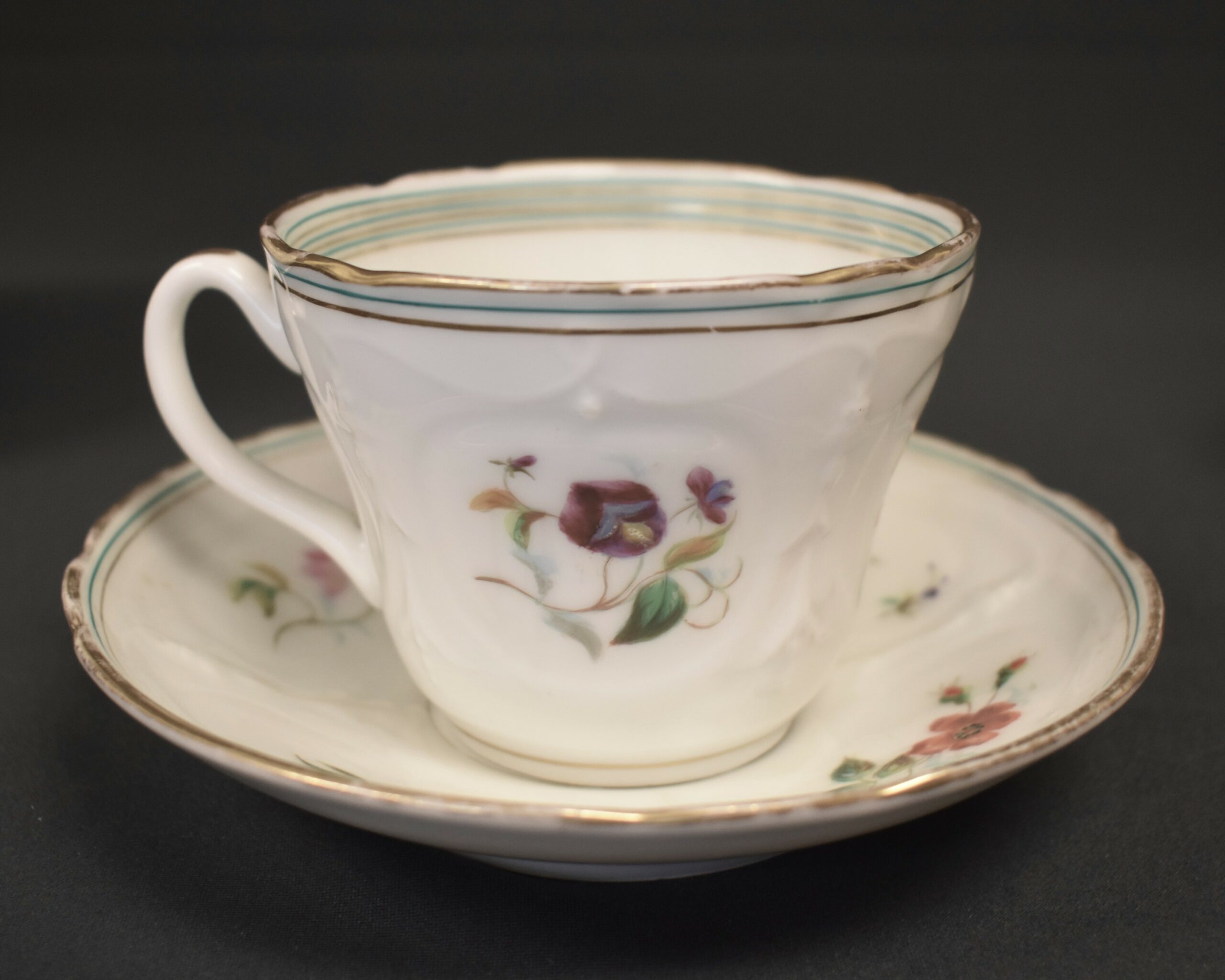 Oliver II began courting Catherine Huchins Seaman (1827-1908), daughter of a wool merchant from Palmyra, New York, and they were married in 1848. Oliver designed this china set and sent the designs to England to be produced for his new bride. This was somewhat unusual as there were many standardized patterns to choose from, but he wanted something special for his future wife. Oliver and Catherine were well known for their hospitality in their home in Mumford2 and one can imagine this beautiful set being used by them. They had eight children, the oldest of whom was Frances Seymour Allen who passed the china to her daughter Ruth Campbell, grandmother of the donor. Oliver and Catherine were laid to rest in the Mumford Rural Cemetery under the largest monument in the cemetery. The tall stone plinth sits on a small rise and can be seen easily from the road.