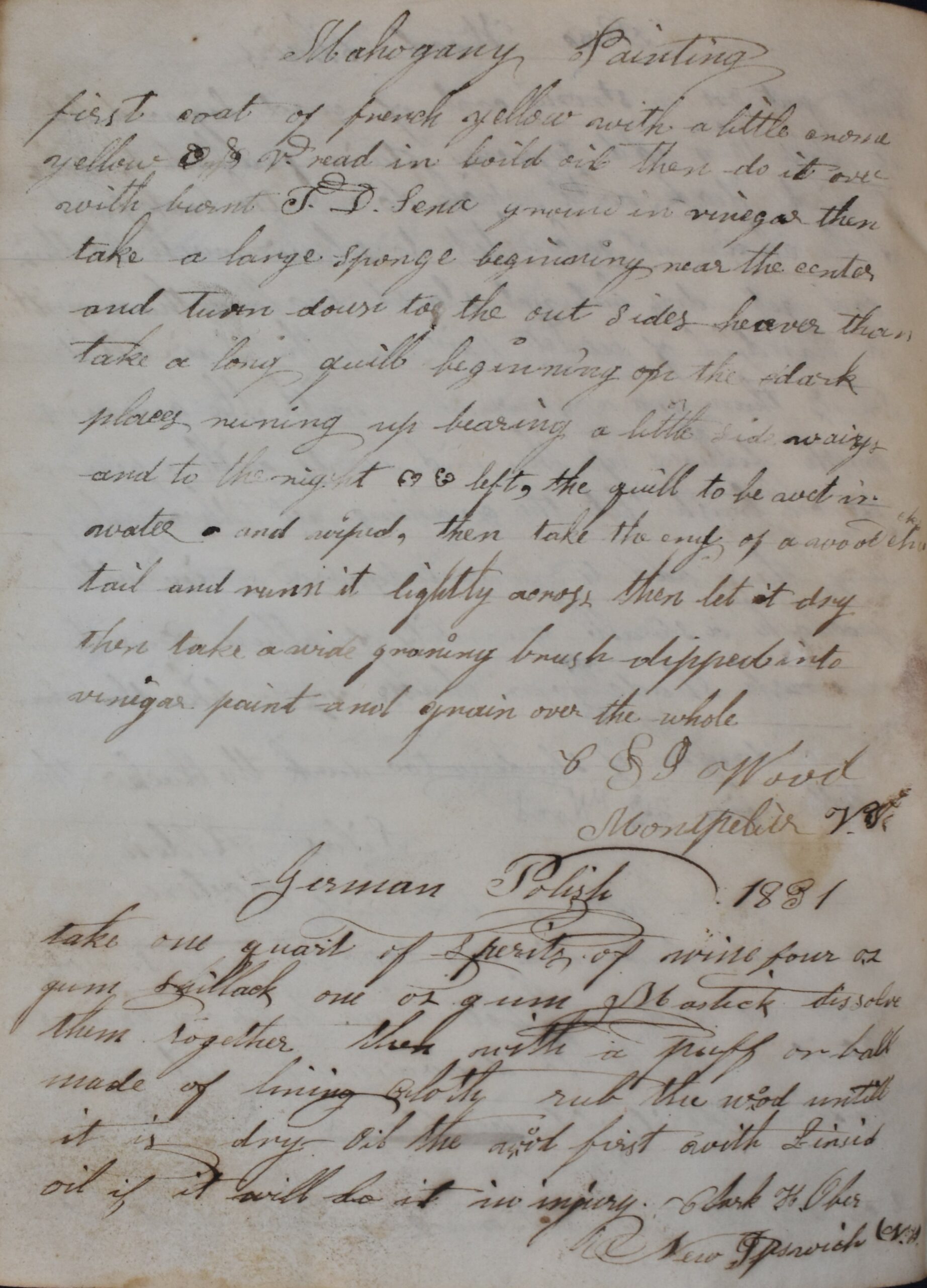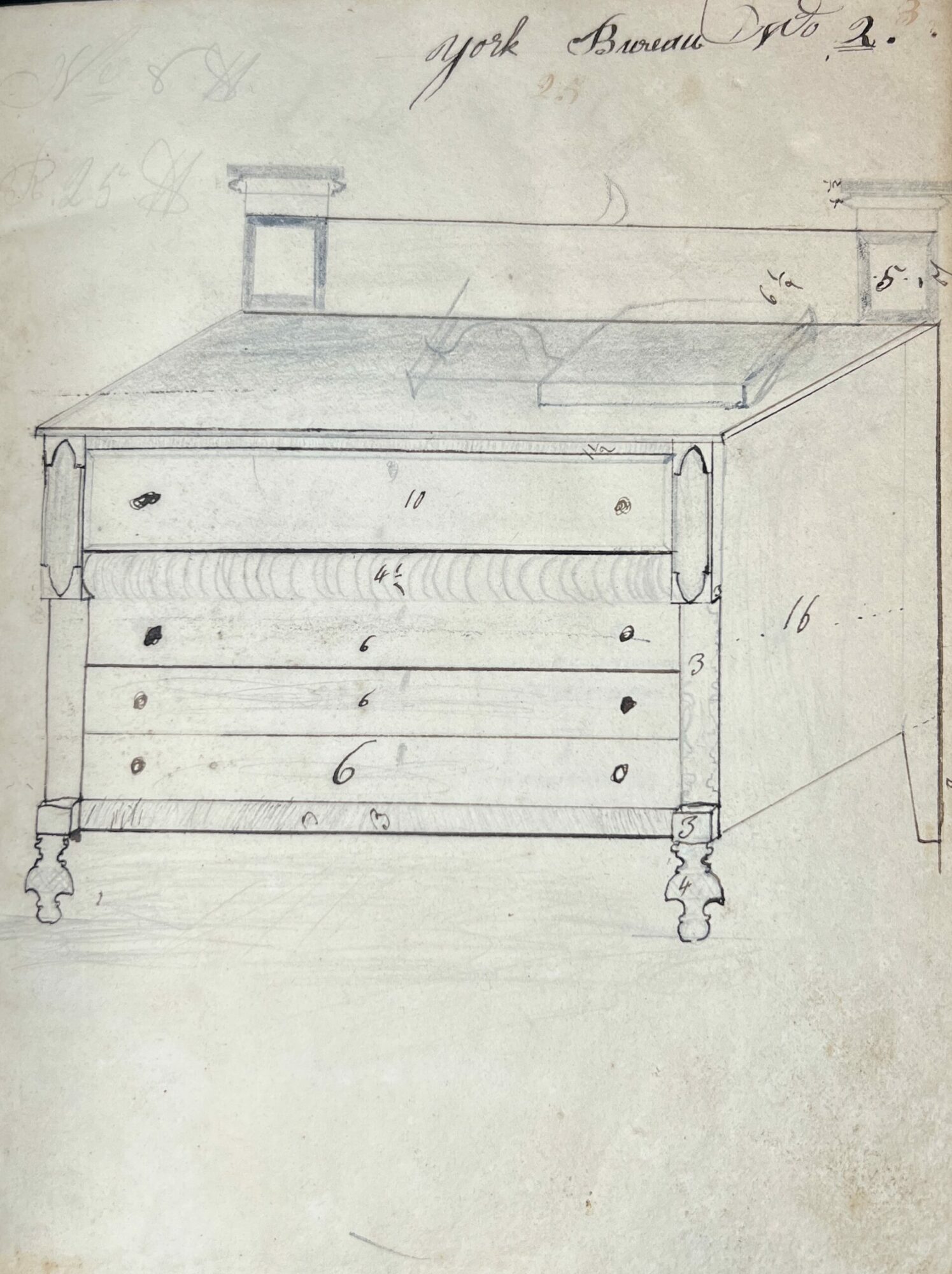 The life of a cabinetmaker was usually not static. As evidenced by the notebook it was important to keep up with the most recent trends in furniture. Many of Richardson’s drawings were likely drawn from observing furniture at showcases and warehouses in larger cities. The “York Bureau” is a style from York, now the city of Toronto. He has a recipe from a cabinetmaker in Boston and we know he spent time in Montpelier. In 1830 C & J Wood stated that, “One of the firm has just returned from New York with the latest city fashions for Cabinet Furniture.”10 While it is not known who this member of the firm was, Richardson would have most certainly visited New York City at least once as it would have been the ultimate dream for any cabinetmaker of the time. And of course, he would have spent quite a bit of time in Albany when he lived there. In one of his drawings, he compares his work to that of Mead & Alvord of Albany. They were the preeminent 1830s cabinetmakers in that city. It reinforces his knowledge and attempts to keep up with the latest styles. The latter part of the 1830s saw a change in the cabinetmaker business. With the Industrial Revolution came the mass production of furniture and cabinetmakers went on the decline until by the end of the 19th century only a few well-known designers were left.