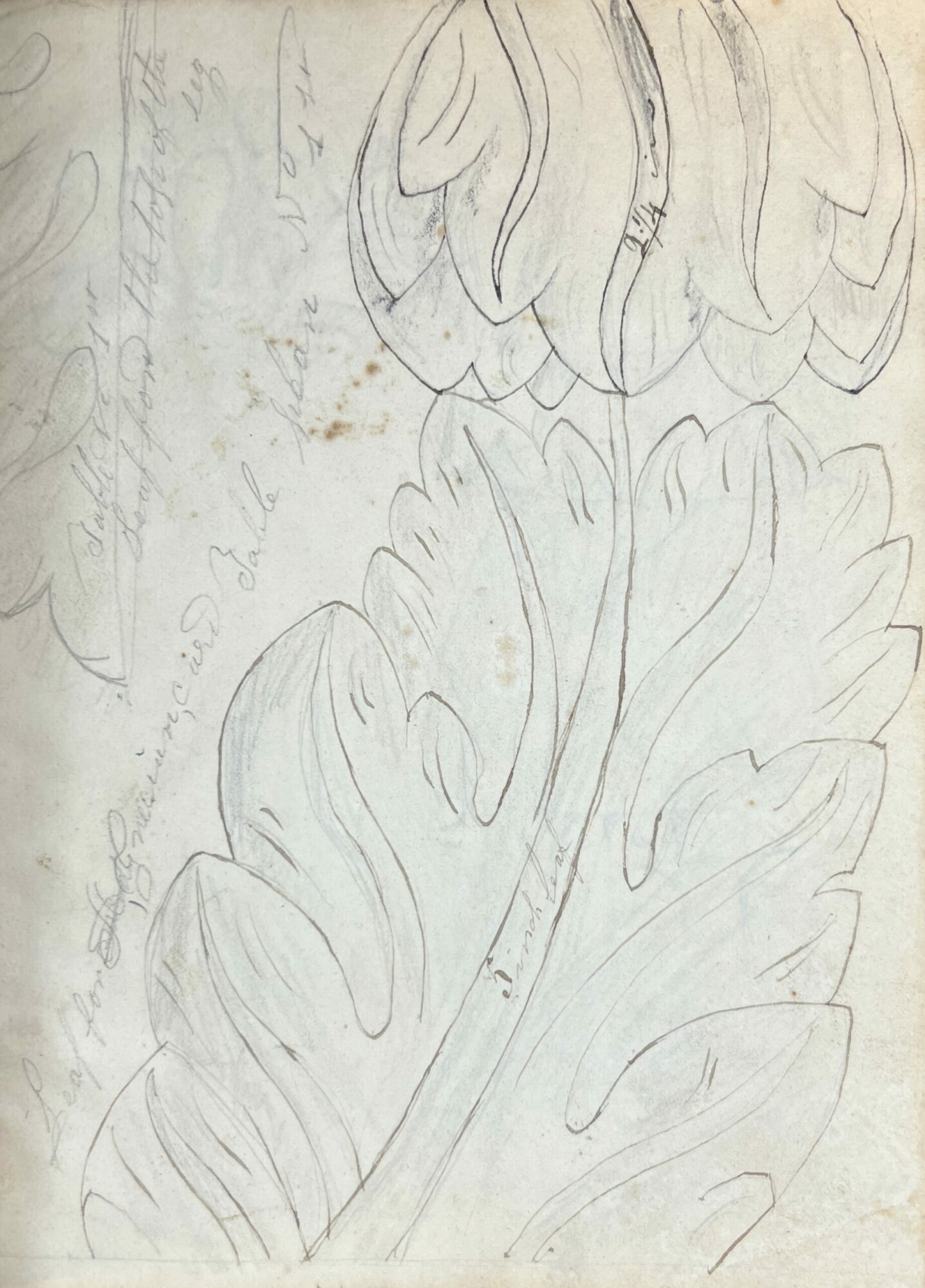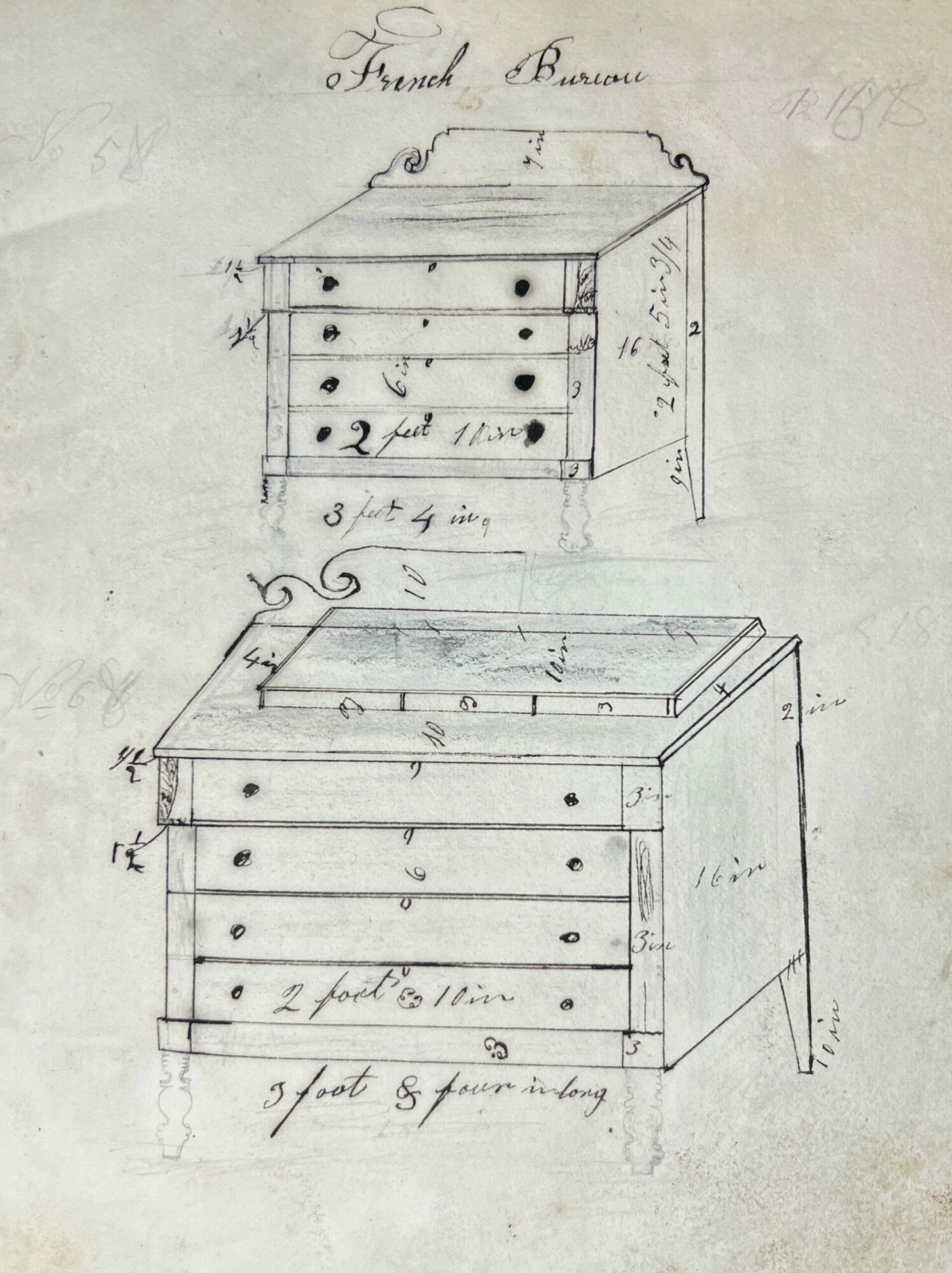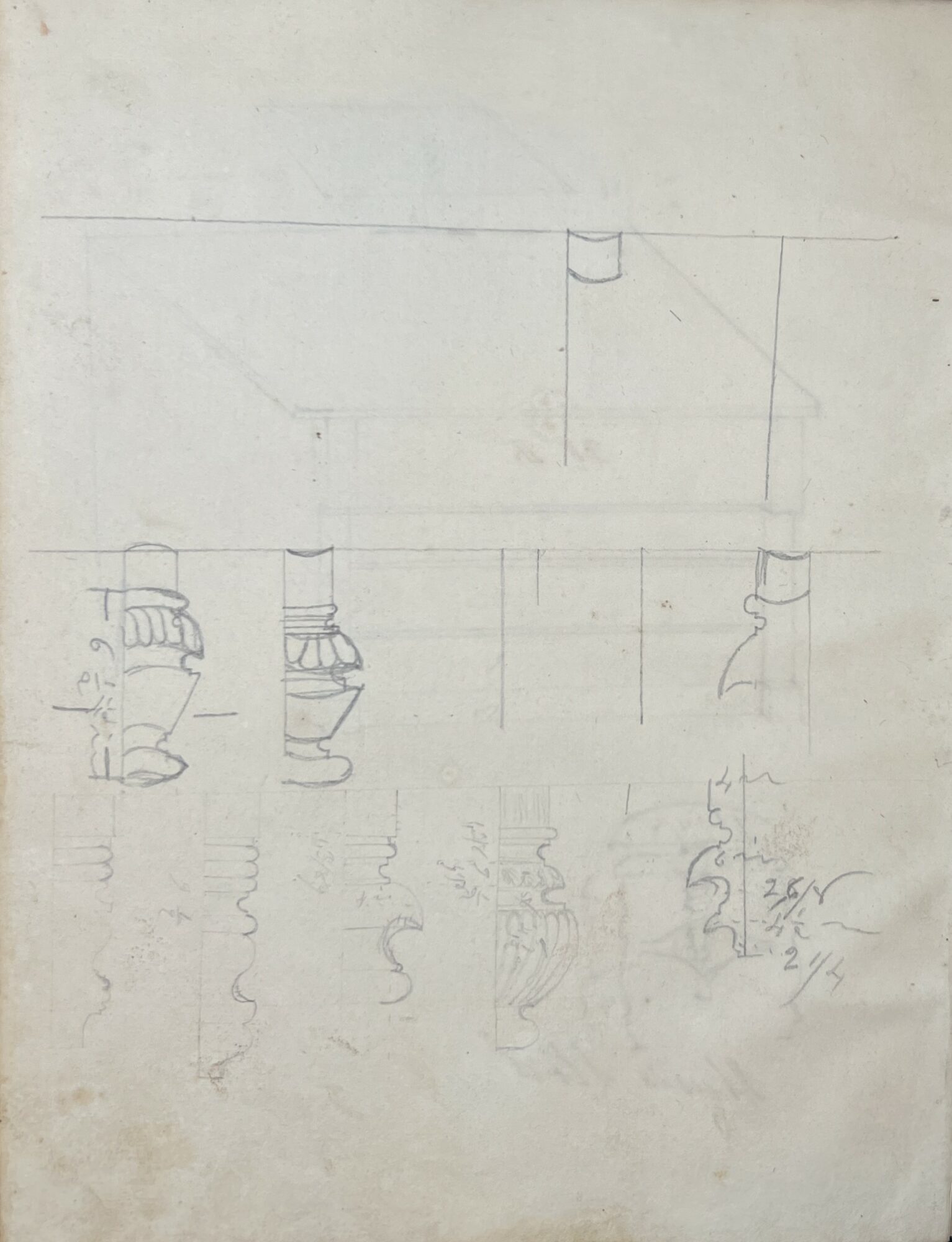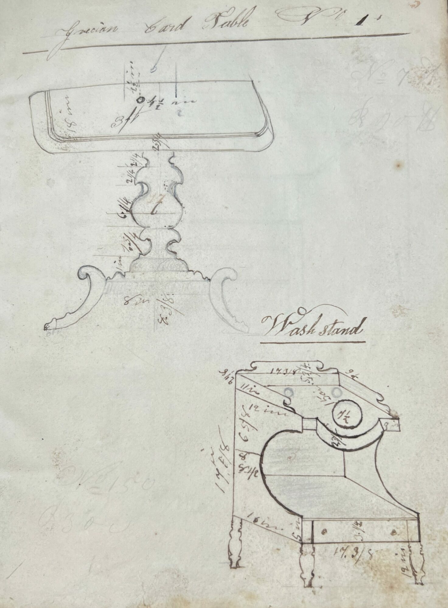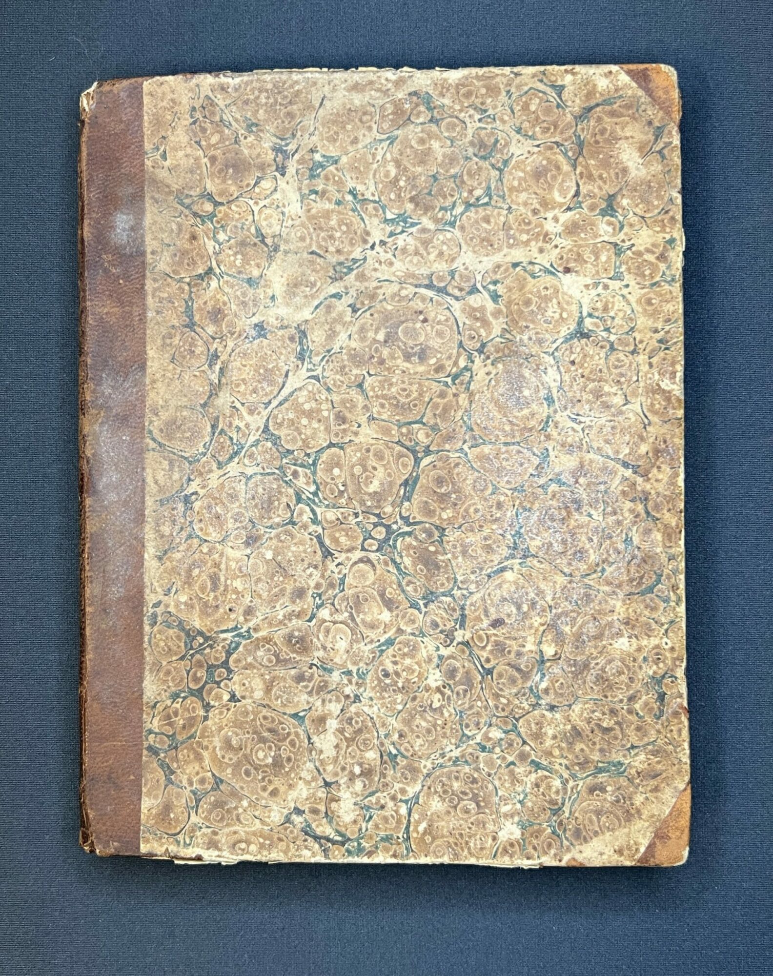 A cabinet maker’s notebook/sketchbook is quarter bound in fine brown calfskin with covers of cream, brown, and blue, marbled paper. Original binding. On the front endpaper written in light pencil it says “Chase Richardson, Sandy Hill, NY, 1832”. The inside pages are filled with drawings of various furniture rendered in both pencil and ink. Furniture is drawn with all measurements notated and most have titles stating the name of the item and the style. In some drawings different options are shown such as different styles of furniture legs and some drawings have prices listed. There are pages filled with designs of patterns that could be carved into the furniture. In the back of the notebook there are more than a dozen extremely detailed recipes for various finishes that have been attributed to the cabinet makers who created the recipe. The recipes are in different hands, possibly the creators of the recipe wrote it in his notebook for him. Various dates throughout are listed from 1830-1833.