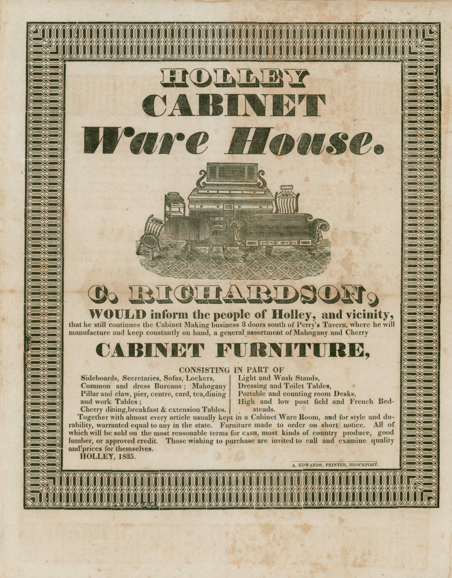 In November of 1835, he mentions in the letter he penned to Charles Wood that he had been gravely ill for “60 days” with “billious fevers” which was a term used for many maladies from malaria to typhoid. Whatever its cause, he became ill and had relapses for more than two months. He writes, “If you had seen me one week since you would knot have known me. I was nothing but a skeleton to appearance…” He then goes on to say he is feeling better and slowly getting back to work. It is around this time that he printed a broadside announcing to “the people of Holley, and the vicinity, that he still continues the Cabinet making business.” The GCV&M has this broadside in their collection as well.
